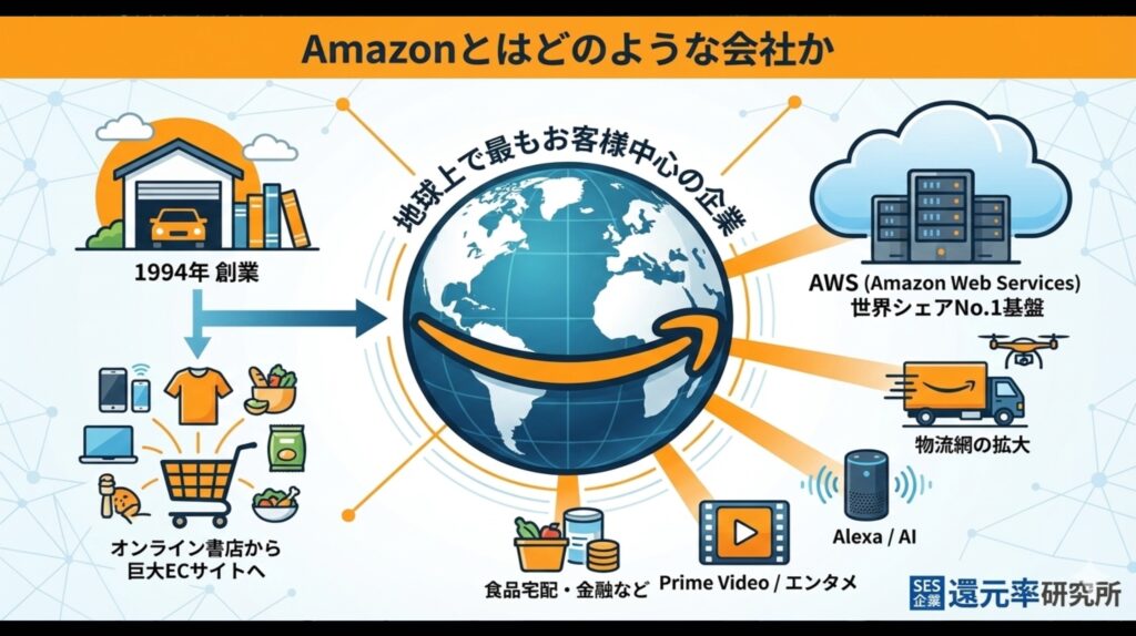 まず、Amazonは1994年にジェフ・ベゾス氏によって創業され、当初はオンライン書店からスタートしました。 その後、家電や衣類、食品に至るまであらゆる商品を取り扱う巨大ECサイトへと成長し、今や「地球上で最もお客様中心の企業」を掲げる世界的なテック企業となっています。(企業理念については[Amazon公式サイト]も参照)