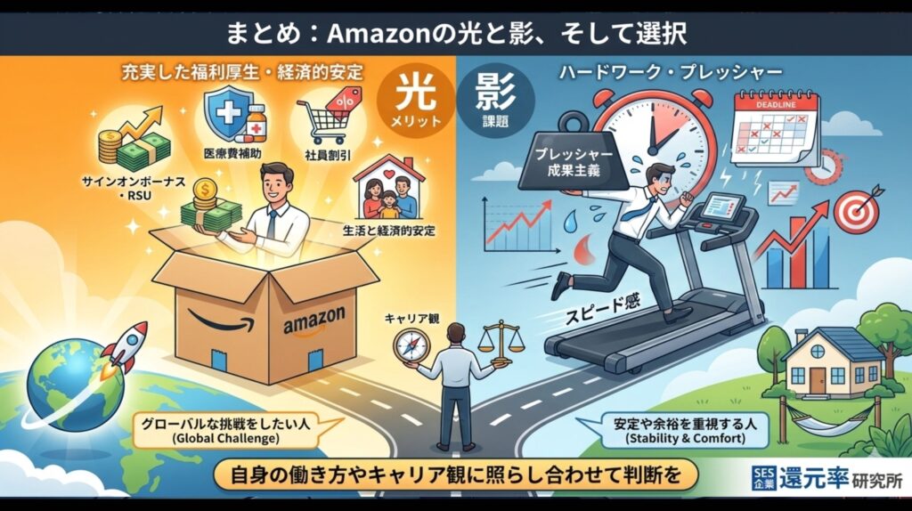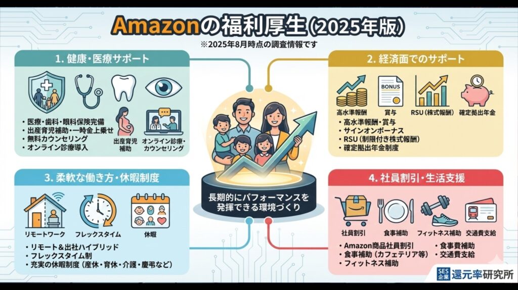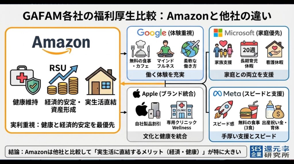 結論として、Amazonはこれら他社と比較して「社員の健康維持と経済的な安定(特にRSUによる資産形成)」を最優先にしており、実生活に直結するメリットが大きい企業と言えます。