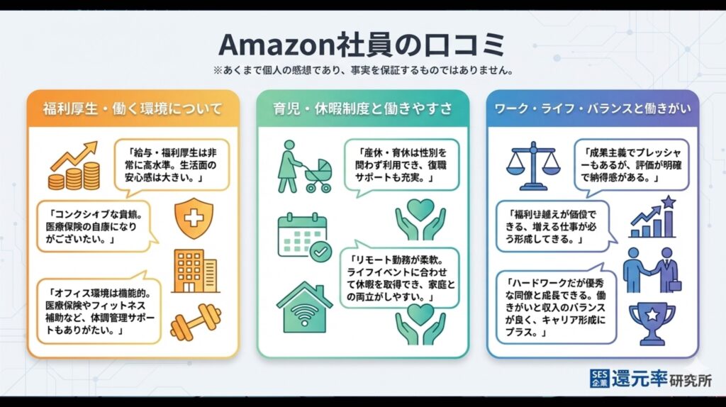 Amazonは社員割引や医療費補助、サインオンボーナスやRSUなど、生活と経済的安定に直結する福利厚生を提供しています。 一方で、成果主義やスピード感のある文化ゆえに、プレッシャーやハードワークも伴います。