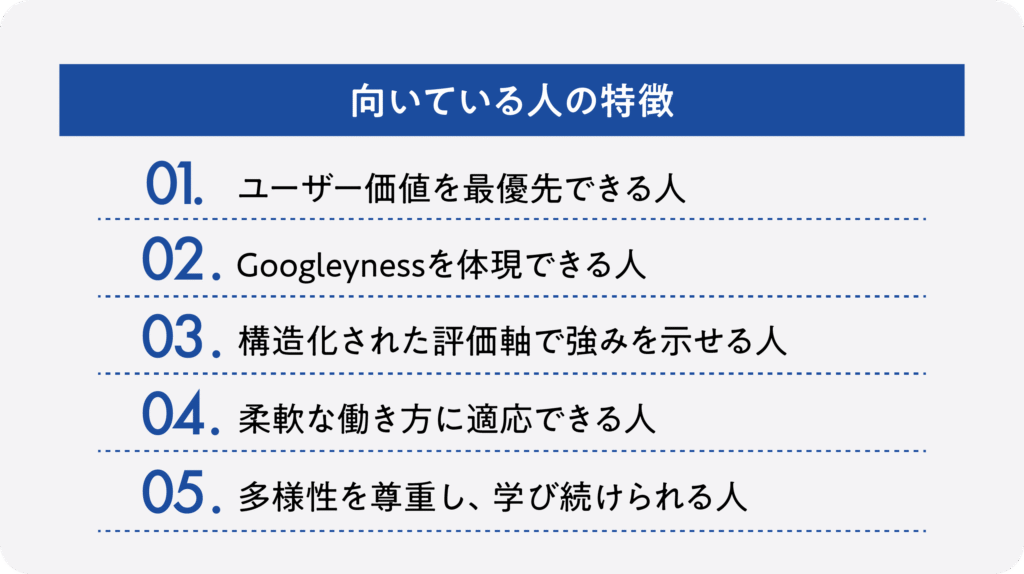 Googleは「Everyoneのために作る」という姿勢を明言しており、多様なバックグラウンドを持つ仲間と協働する文化があります。異なる意見を歓迎し、そこから学びを得てプロダクトに反映できる人が評価されやすいです。