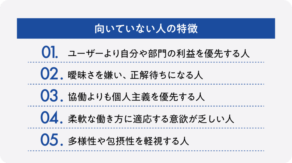 「ユーザーに焦点を絞れば、他のものはみな後からついてくる」という哲学に共感できない人や、短期的な数字だけを追いがちな人はカルチャーと噛み合いにくいでしょう。 - 曖昧さを嫌い、正解待ちになる人