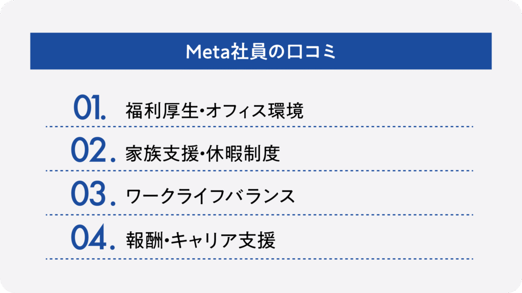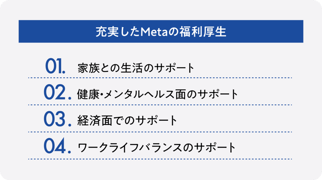 Metaでは、こうした一般的な人気制度を網羅するだけでなく、さらにユニークで手厚いサポートを提供しているのが特徴です。次のセクションでは、Metaが具体的にどのような福利厚生を用意しているのか、さらに詳しく掘り下げていきます。