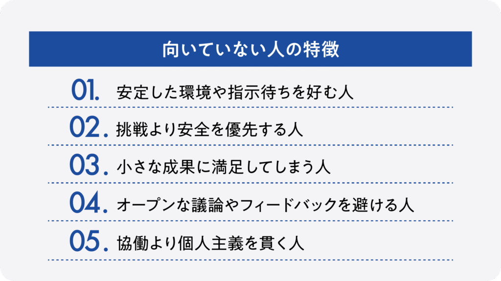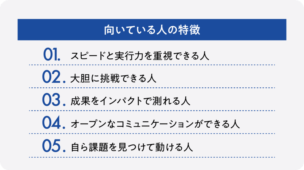 変化のスピードが速く、常に新規プロジェクトや方針転換があるため、安定志向やトップダウンの指示を待つ働き方では適応が難しいです。 - 挑戦より安全を優先する人