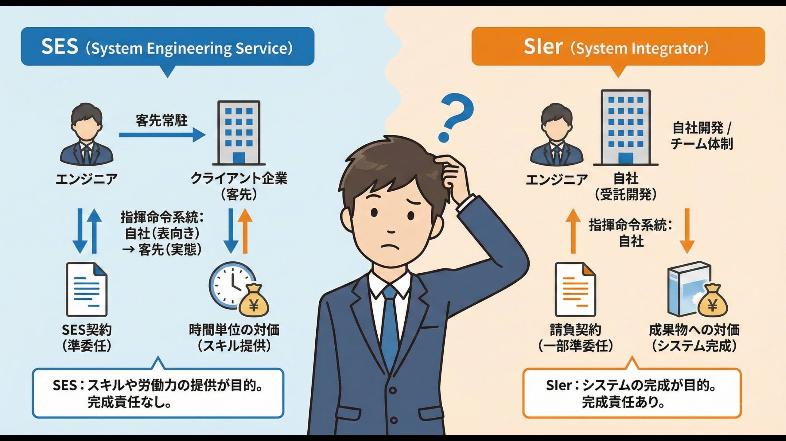 | 項目 | SES(客先常駐) | SIer(受託開発) |