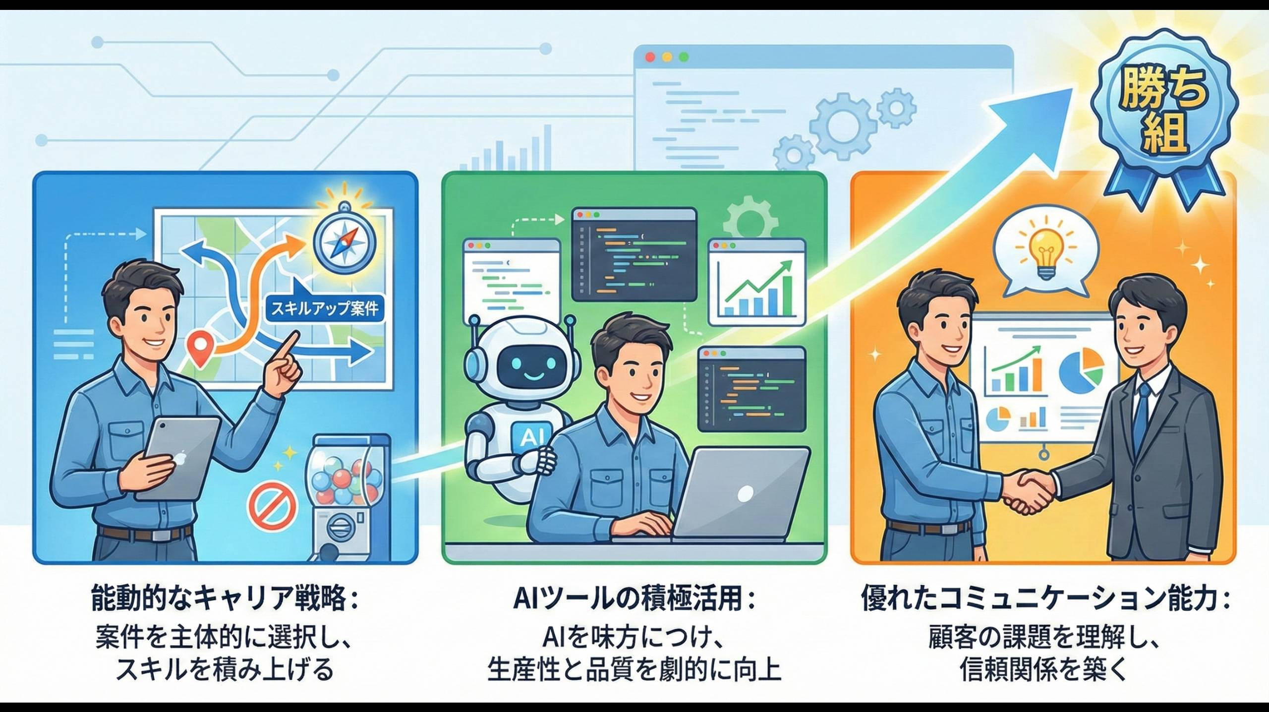 同じSES企業に入社しても、数年でメガベンチャーのCTOになったり、高単価のフリーランスとして独立したりする「勝ち組」がいます。彼らには共通するマインドセットがあります。