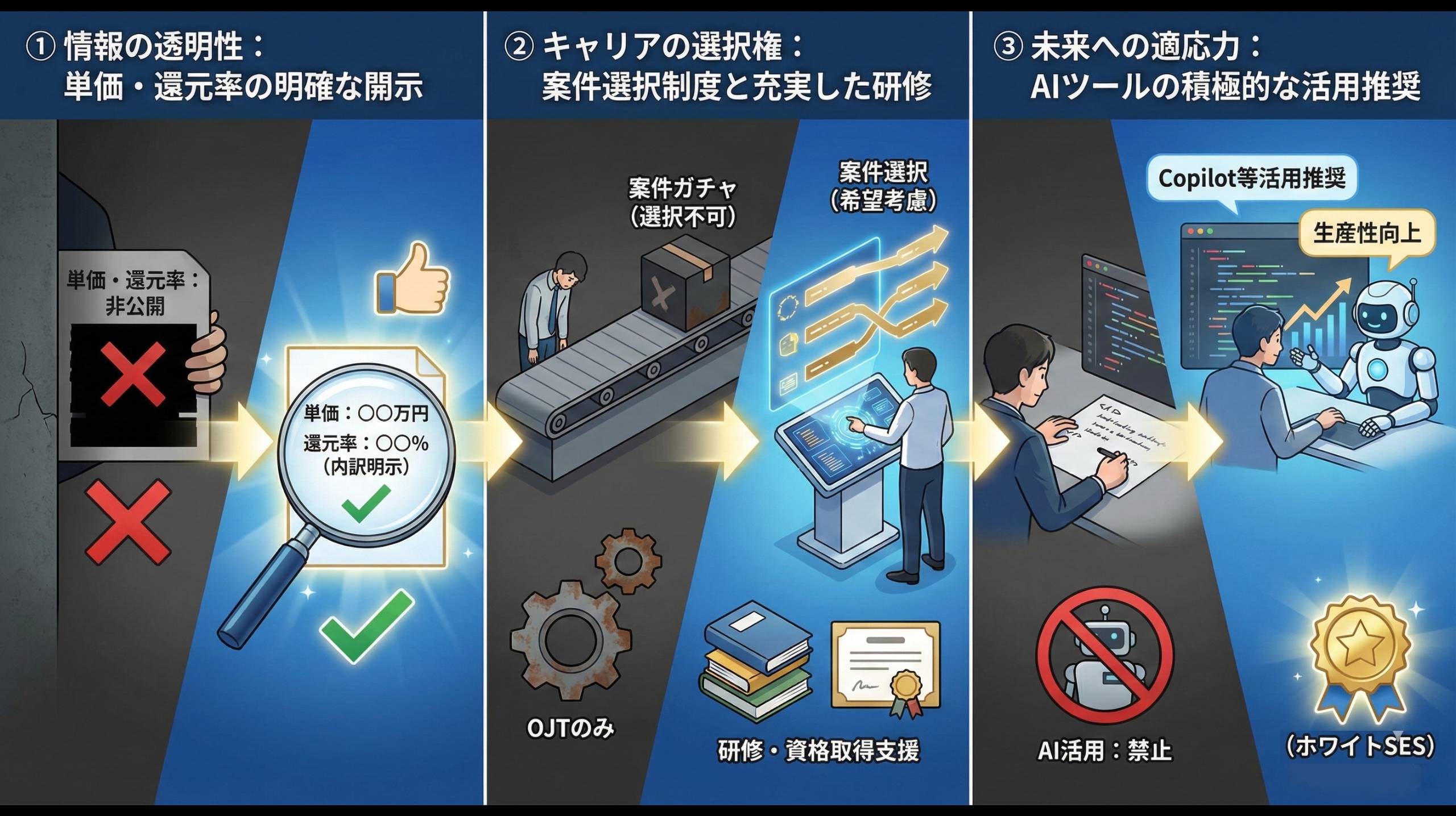 自分の市場価値(クライアントからの契約金額)をオープンにしており、給与への還元率が高いか。これを隠す企業は中抜きの温床です。