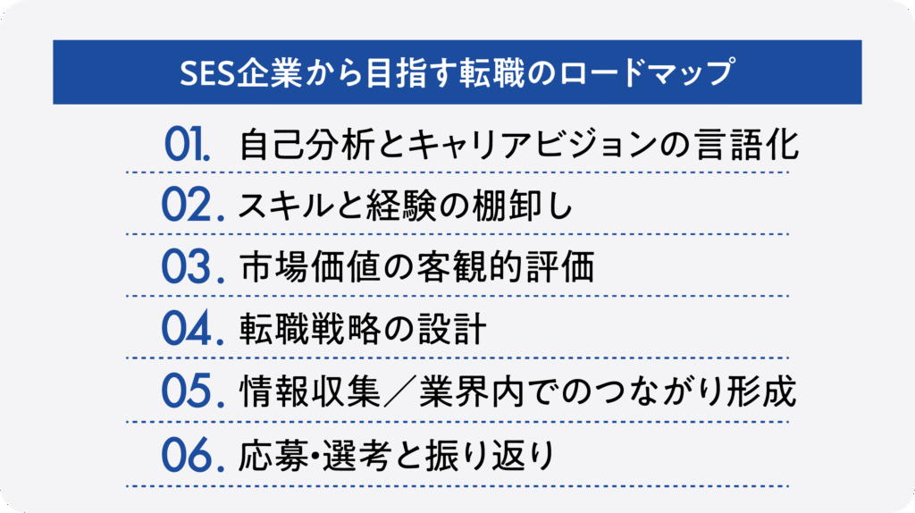 SES企業から転職を考える際、最も重要なのは「何を軸に」「どの順序で」進めるかを明確にすることです。ロードマップを考えずに動き始めると、求人情報に振り回され、理想と異なる環境に流されてしまう危険性があります。このセクションでは、転職活動を成功させるための重要なプロセスを6つに分けて解説していきます。
