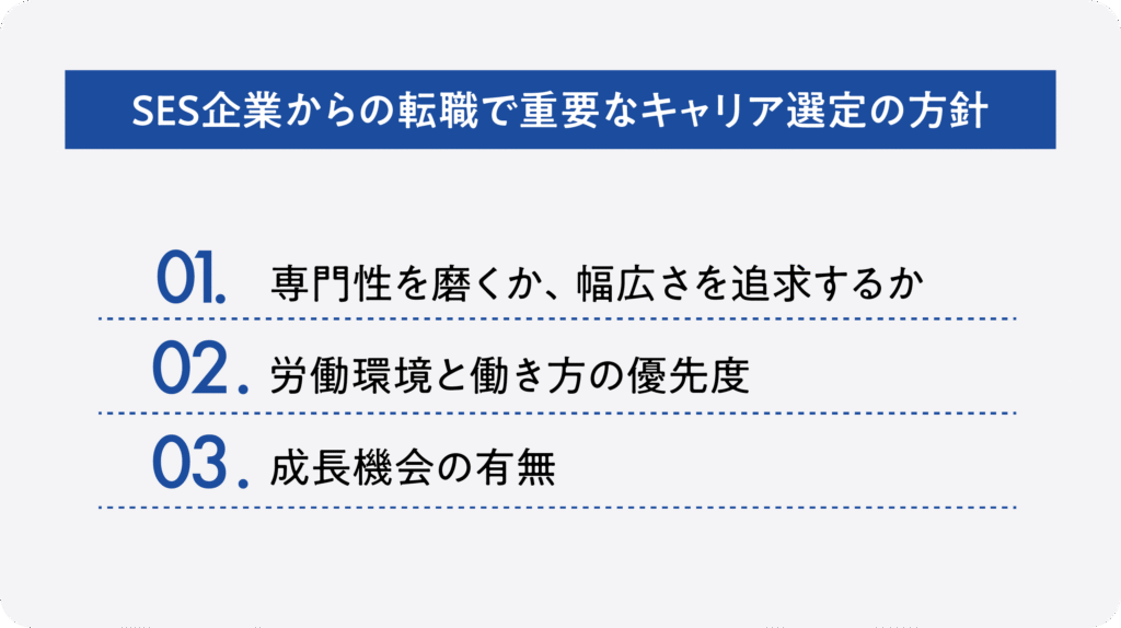 SES企業からのキャリアを築く際には、単に条件の良い転職先を探すだけでなく、自身の方針を明確に持つことが大切です。方針を持たないまま転職すると、環境が変わっても不満が続き、再び転職を繰り返すリスクがあります。ここでは、キャリア選定で重視すべき観点を紹介します。