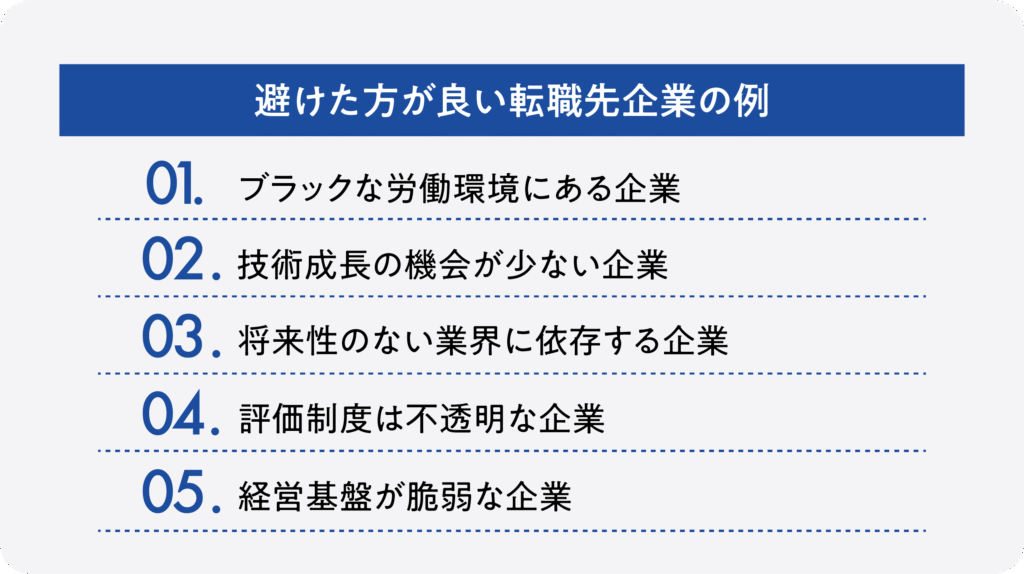 SES企業からの転職において、すべての選択肢が正解とは限りません。一見魅力的に見えても、実際にはキャリア停滞や労働環境の悪化につながるケースもあります。ここでは避けるべき企業の特徴を整理します。