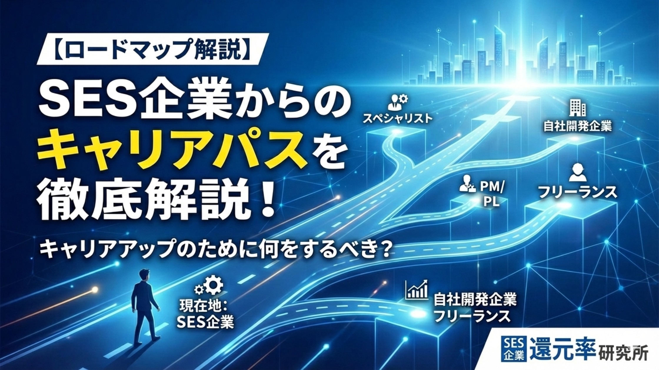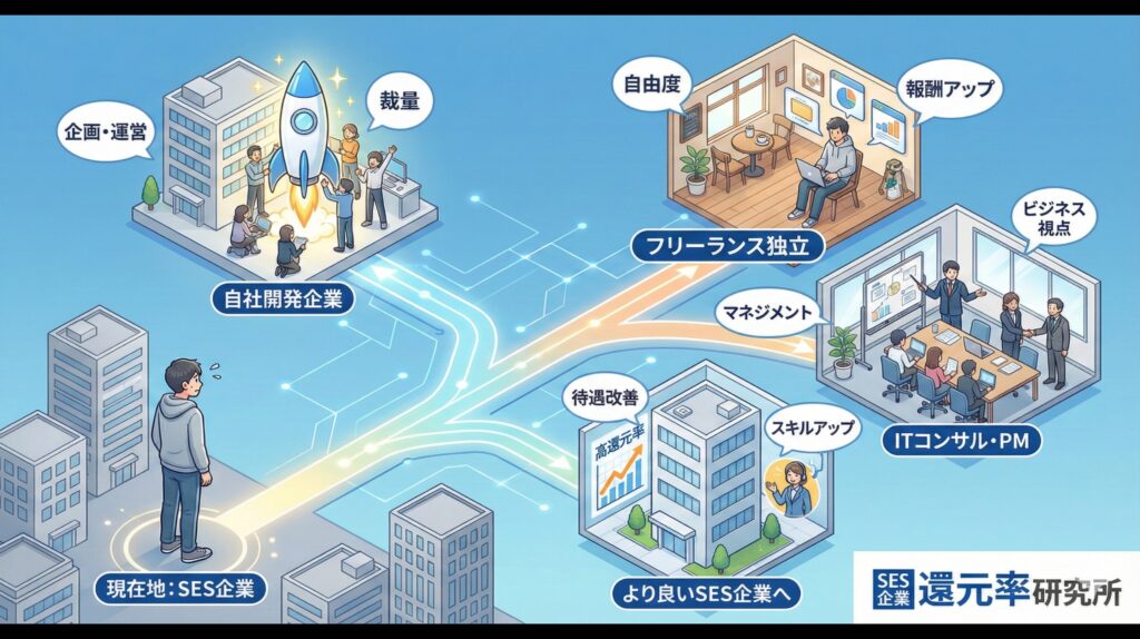 別のSES企業へ移る選択も、現実的なキャリアパスの一つと言えます。同じSES業界であっても、企業ごとに還元率や案件の質、サポート体制には大きな差があります。現職では得られないスキルアップや待遇改善を求めて、より良い環境のSES企業へ転職するケースも珍しくはありません。キャリアアップを目指すのであれば、SES企業同士を比較し、還元率や教育制度、案件選択の自由度といった要素を冷静に見極めることが重要です。