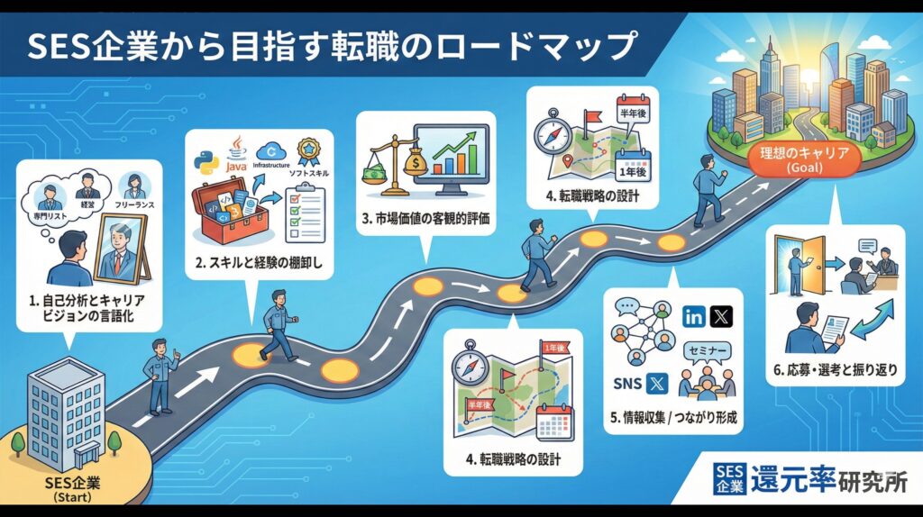 SES企業から転職を考える際、最も重要なのは「何を軸に」「どの順序で」進めるかを明確にすることです。ロードマップを考えずに動き始めると、求人情報に振り回され、理想と異なる環境に流されてしまう危険性があります。このセクションでは、転職活動を成功させるための重要なプロセスを6つに分けて解説していきます。