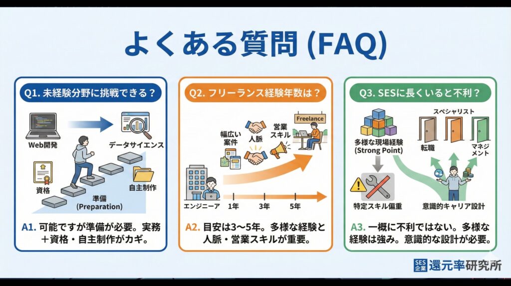 SES企業からのキャリアパスについては、多くのエンジニアが同じような疑問を抱きます。ここではよくある質問を取り上げ、実態に基づいて回答します。