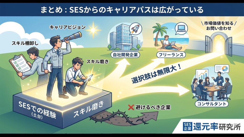SES企業からのキャリアパスは、決して閉ざされているわけではありません。自社開発企業やフリーランス、コンサルタントなど、選択肢は広がっています。重要なのは、自身のスキルを棚卸しし、キャリアビジョンを明確にすることです。そのうえで、需要の高いスキルを磨き、避けるべき企業を見極めながら転職活動を進めれば、キャリアアップの可能性は大きく広がるでしょう。SES企業での経験を「通過点」とするか「土台」とするかは、自分自身の選択次第です。