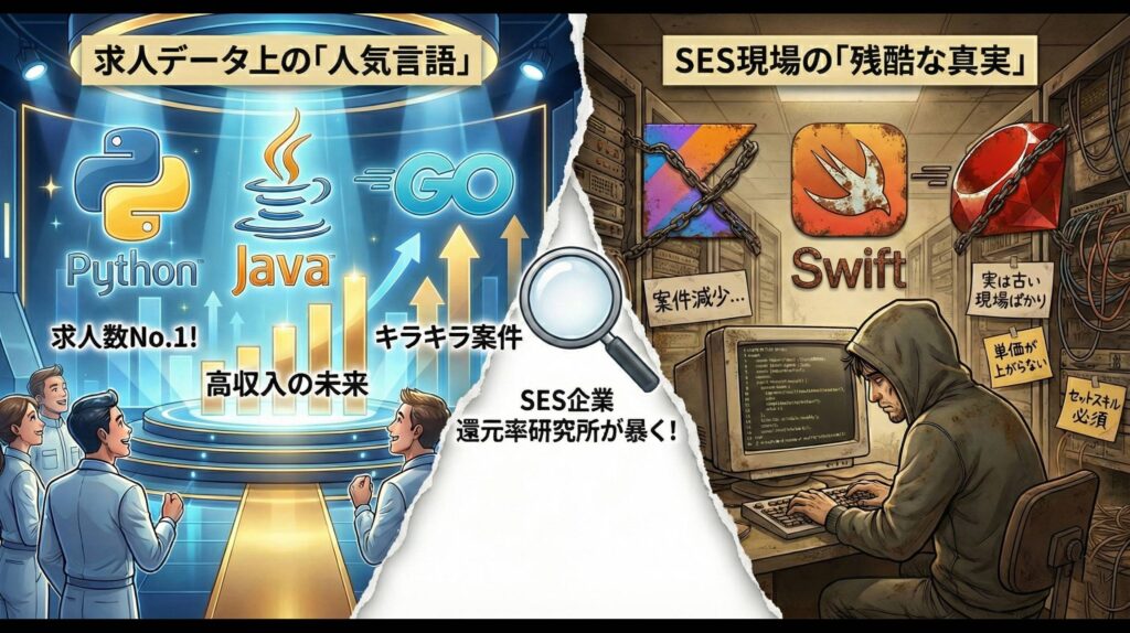 転職サイトの求人数ランキングを見れば、どの言語が人気かは一目瞭然です。しかし、SESの現場で実際に働いているエンジニアなら気づいているはずです。「ランキング上位の言語なのに、なぜか高単価な案件が回ってこない」「人気と聞いたのに、現場は古いシステムばかりだ」—と。
