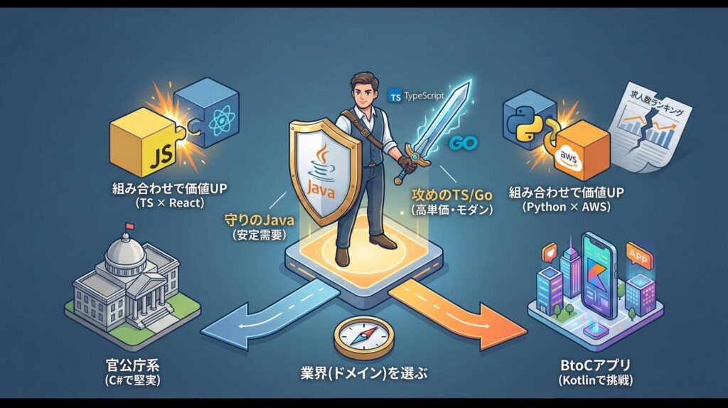 1 .「Java」で守りを固め、「TypeScript」や「Go」で攻める 需要の底堅い言語を軸にしつつ、単価の高いモダン言語をサブウェポンとして習得する。