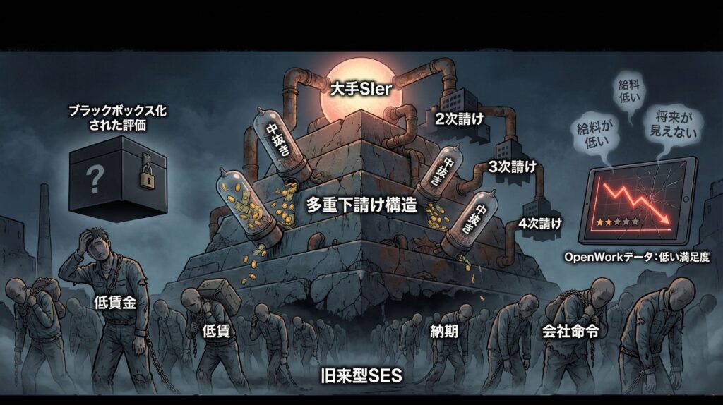大手SIerを頂点とし、2次請け、3次請け…と連なるピラミッド構造。下に行けば行くほど、商流の「中抜き」によって単価は削られ、納期は厳しくなります。 「お前はあそこに行ってこい」と会社命令で飛ばされ、自分の評価額(単価)も知らされず、低賃金で働く。これが「旧来型SES」の正体です。