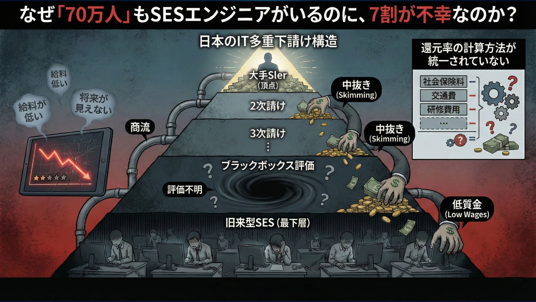 日本のエンジニアの約7割、およそ70万人がSES(客先常駐)に従事していますが、その大半は「案件ガチャ」に怯え、先の見えないトンネルを歩き続けています。 本記事では、あるSES企業の社長が書き殴った「業界の裏メモ」と、最新の対談データを元に、この業界の「残酷なリアル」と、そこから生き残るための「生存戦略」を提示します。