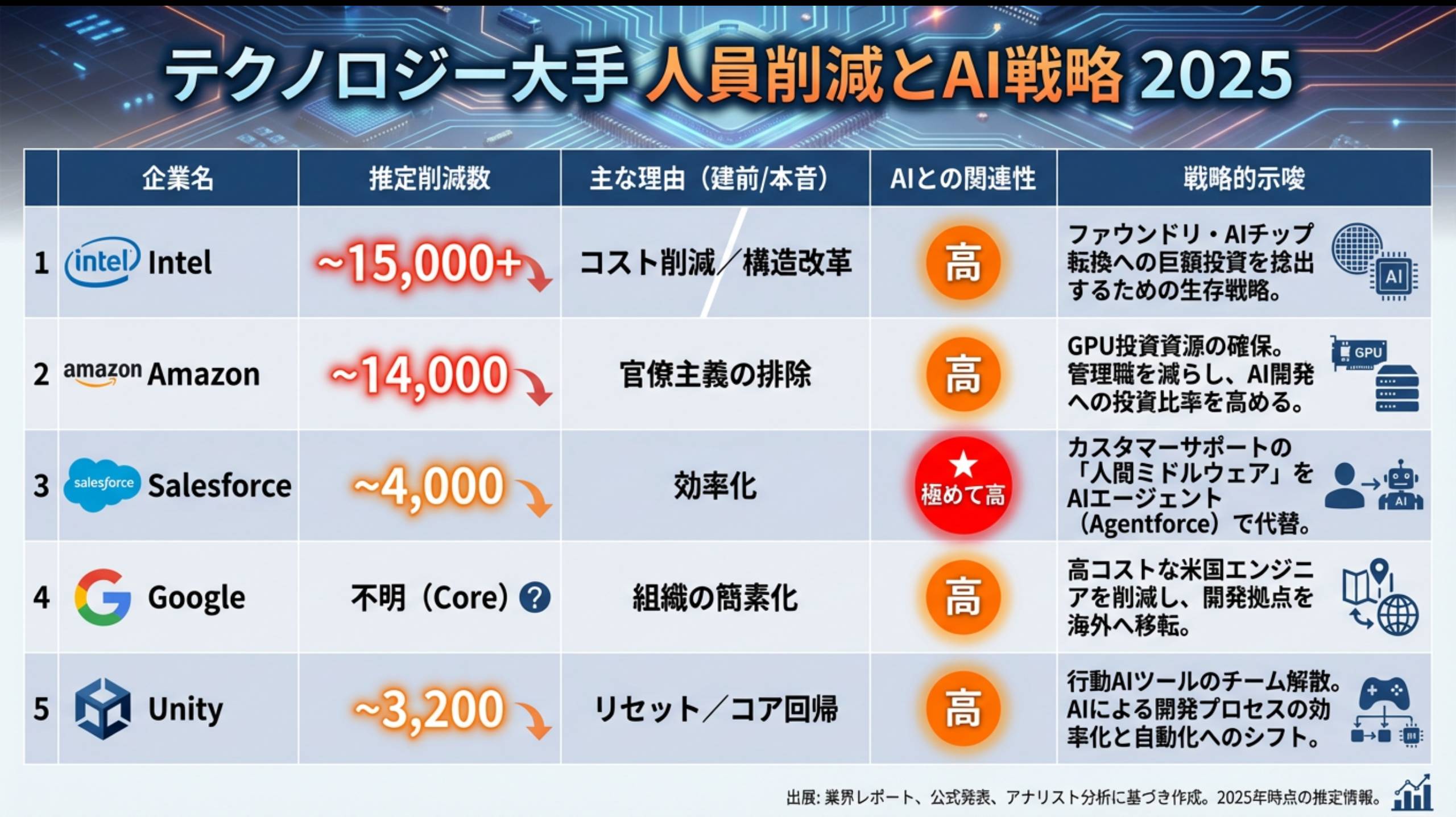 表 1:主要企業のレイオフとその戦略的背景(2024-2025)