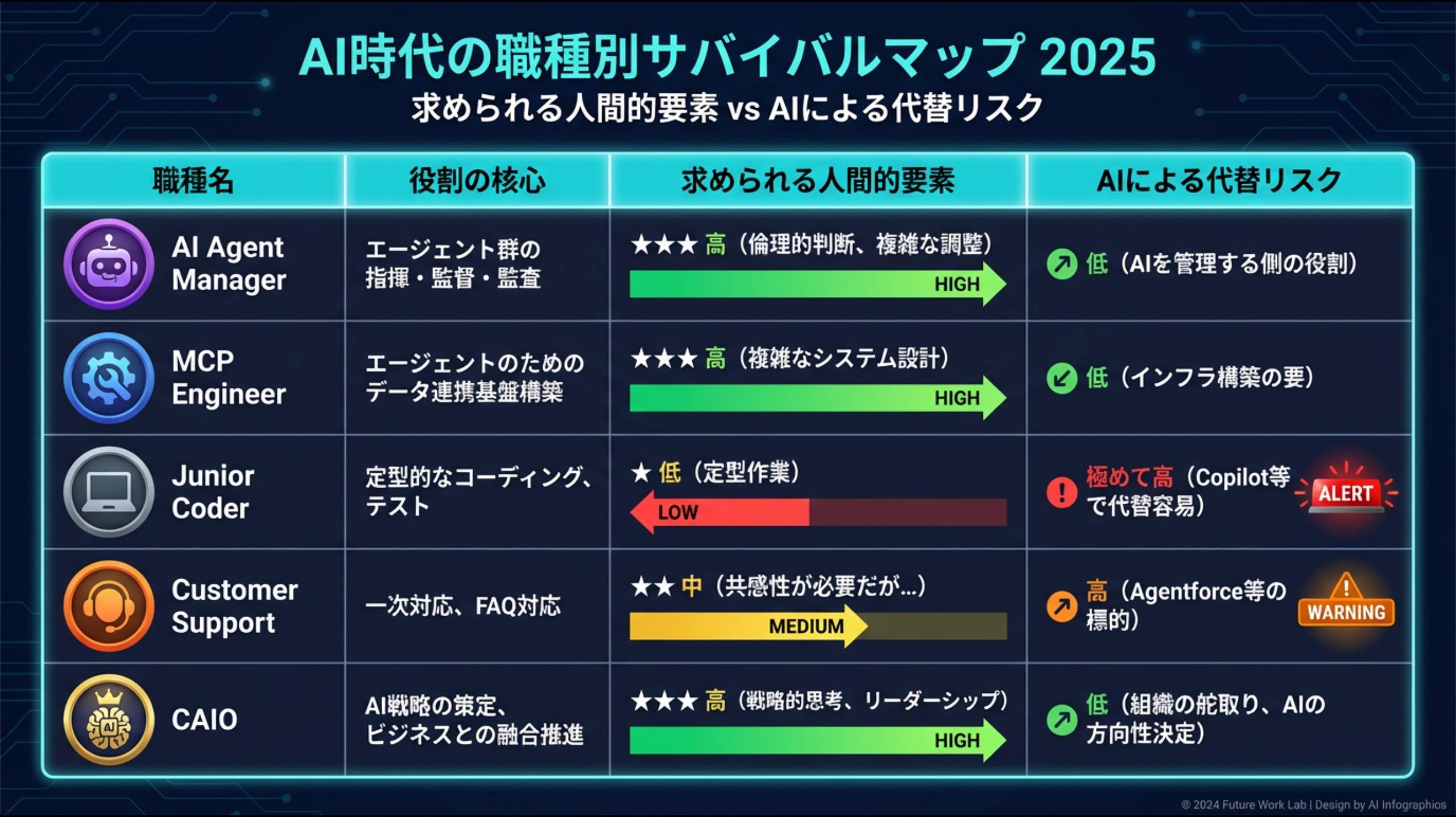 • AI エージェント・マネージャー (AI Agent Manager): AI モデルを開発するのではなく、デジタルな労働者(エージェント)のパフォーマンスを監視、評価、最適化する役割。Citi やInflux などの企業で求人が始まっています。